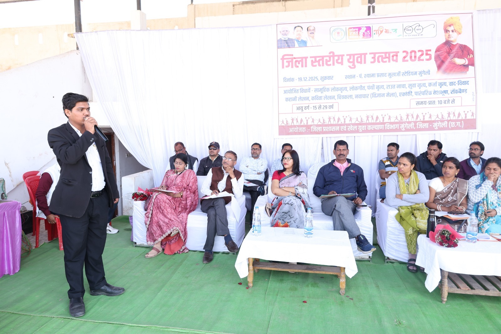 मुंगेली, कुणाल सिंह ठाकुर। जिला प्रशासन, खेल एवं युवा कल्याण विभाग के तत्वावधान में जिला स्तरीय युवा महोत्सव, 2025 का आयोजन डॉ श्यामा प्रसाद मुखर्जी स्टेडियम मुंगेली में सफलतापूर्वक सम्पन्न हुआ। युवाओं को कला एवं संस्कृति के क्षेत्र में मंच प्रदान करने के उद्देश्य से प्रतिवर्ष आयोजित होने वाले इस महोत्सव में जिलेभर के प्रतिभाशाली युवाओं ने उत्साहपूर्वक सहभागिता निभाई। कार्यक्रम में विशेष रूप से आयोजित वाद विवाद प्रतियोगिता में जिले के प्रतिभाशाली युवा सूरज शर्मा ने प्रथम स्थान प्राप्त किया।