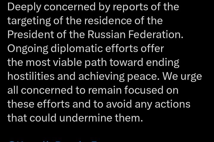 रूस के राष्ट्रपति आवास को निशाना बनाए जाने की खबरों से हम बेहद चिंतित हैं। वर्तमान में जारी राजनयिक प्रयास, शत्रुता को समाप्त करने और शांति स्थापित करने का सबसे बेहतर मार्ग हैं। हम सभी संबंधित पक्षों से आग्रह करते हैं कि वे इन प्रयासों पर ध्यान केंद्रित रखें और ऐसे किसी भी कार्य से बचें जो इन्हें कमजोर कर सकता है।