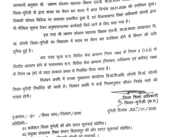 प्राप्त जानकारी के अनुसार, 5 जनवरी को सहायक शिक्षक लक्ष्मण कोलाम नशे की हालत में विद्यालय पहुंचे थे। इस दौरान किसी व्यक्ति द्वारा बनाए गए वीडियो के वायरल होते ही शिक्षा विभाग हरकत में आया। खंड शिक्षा अधिकारी (BEO) ने मामले की पुष्टि करते हुए जिला शिक्षा अधिकारी मुंगेली एल.पी. डाहिरे को अवगत कराया और तत्काल अनुशासनात्मक कार्रवाई की अनुशंसा की।