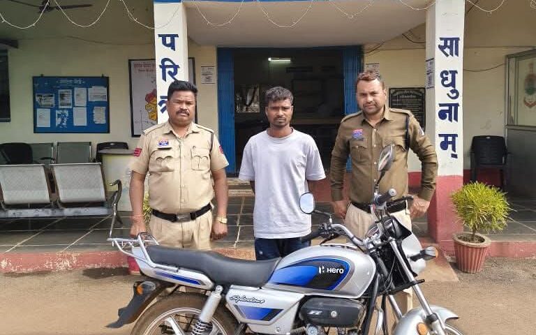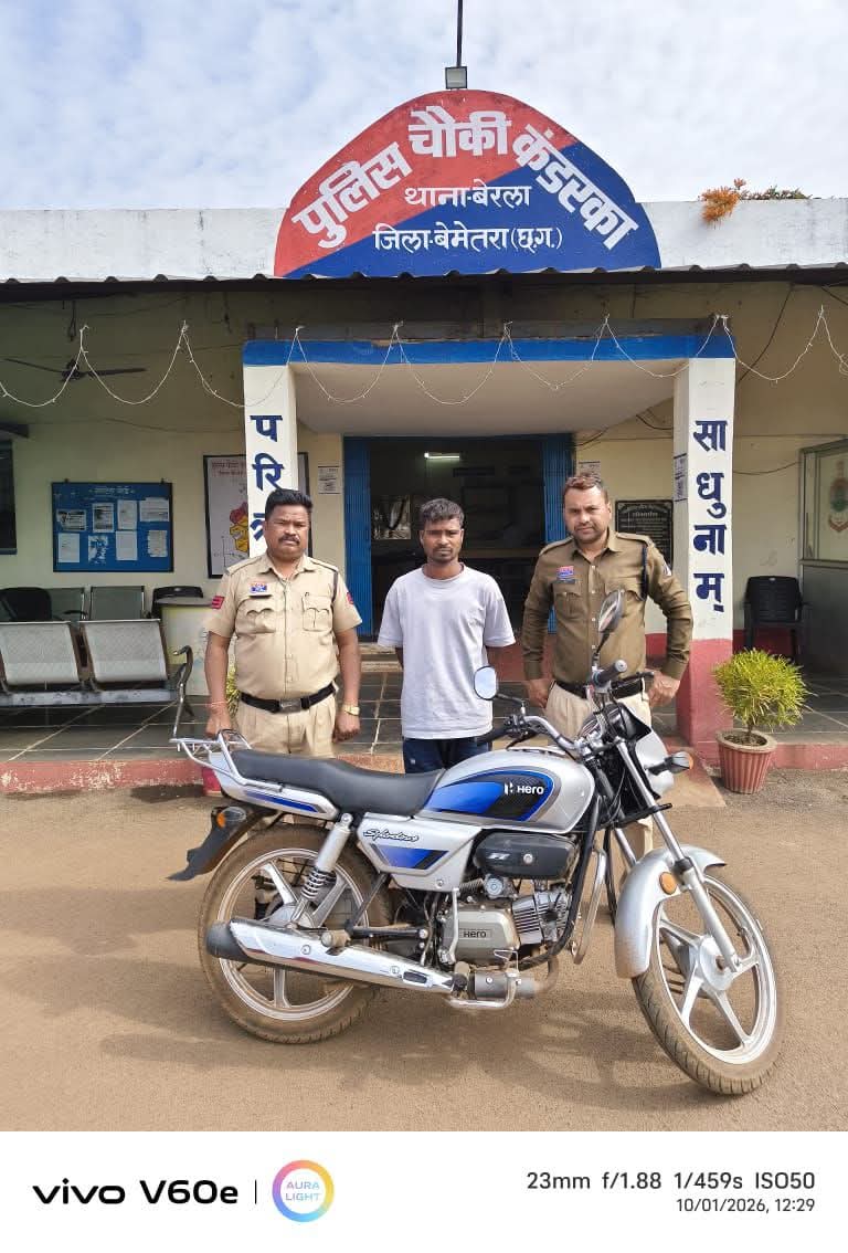 बेमेतरा, कुणाल सिंह ठाकुर। एसएसपी बेमेतरा रामकृष्ण साहू (IPS) के निर्देशन पर बेमेतरा पुलिस द्वारा अवैध गतिविधियों पर लगातार प्रभावी कार्यवाही जारी है । साइबर सेल बेमेतरा एवं चौकी कंडरका पुलिस टीम की संयुक्त कार्यवाही के द्वारा चोरी हुए मोटर सायकल जिसकी कीमती लगभग 45 हजार रूपए सहित आरोपी को गिरफ्तार किया गया। आरोपी मोनू मरकाम ऊर्फ मोन्टू पिता कन्हैया मरकाम उम्र 23 वर्ष, निवासी सिलघट चौकी कंडरका थाना बेरला, जिला बेमेतरा को आज दिनांक 10.01.2026 को विधिवत गिरफ्तार वैधानिक कार्यवाही की गई।