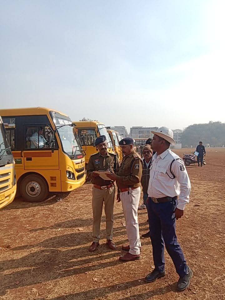 दुर्ग, कुणाल सिंह ठाकुर। सड़क सुरक्षा माह 2026″ के दौरान आज दिनांक 18/01/2026 को सुप्रीम कोर्ट के गाईड लाईन के अनुसार स्कूली छात्र छात्राओं के सुरक्षित परिवहन को ध्यान में रखते हुए, यातायात पुलिस दुर्ग एवं परिवहन विभाग द्वारा संयुक्त रूप से पुलिस ग्राउण्ड सेक्टर 06 भिलाई में स्कूल बस जांच शिविर का आयोजन किया गया, जिसमें जिले के 06 स्कूलों के छात्र छात्राओं के परिवहन करने वाले 46 बसों का जांच किया गया है। वाहन की जांच शिविर का उददेश्य छात्र छात्राओं का सुरक्षित परिवहन से है। जांच शिविर के दौरान सर्व प्रथम वाहनों का रजिस्ट्रेशन किया गया तत्पश्चात परिवहन विभाग द्वारा स्कूल बसो के दस्तावेजो की जांच की गई जांच के दौरान वाहन का रजिस्टेशन, परमिट, फिटनेश, बीमा, पीयूसी, रोड टैक्स, वाहन चालक का लायसेंस चेक किया गया। इसके बाद वाहनो का मैकनिकल फिटनेश जांच किया गया जिसके अंतर्गत हेड लाईट, ब्रेक लाईट, पार्किग लाईट, इन्डिकेटर लाईट, बैक लाईट, मीटर, स्टेरिंग की स्थिति, टायर की स्थिति, क्लच, ऐक्सीलेटर, सीट की स्थिति, हॉर्न की स्थिति, वॉयपर एवं वाहन में आगे पीछे रिफ्लेक्टर लगा है कि नहीं चेक किया गया। चेंकिग के क्रम में सुप्रीम कोर्ट द्वारा निर्धारित मापदण्ड के अनुरूप जैसे वाहन में जीपीएस, सीसीटीवी कैमरा, स्पीड गर्वनर, प्रेर्शर हार्न, आपातकालीन खिडकी, स्कूल का नाम, टेलीफोन नंबर, चालक का मोबाईल नंबर, फर्स्ट ऐड बॉक्स, अग्नि शमन यंत्र, स्कूल बस के आगे पीछे स्कूल बस लिखा है की नहीं चेक किया गया। जांच के दौरान यातायात पुलिस एवं परिवहन विभाग द्वारा कुल 10 स्कूली बसो पर चालान करते हुए 3000 रूपये समन शुल्क वसूल किया गया। तत्पशचात चालक परिचालक के स्वास्थ्य संबंधी जांच की गई जिसमें आंखो की जांच किया गया। जिसमें 05 चालको को आंखो संबंधित शिकायत पाई गई जिन्हे चश्मा लगाने एवं लगे हुवे चश्मे में नंबर बढ़ाने हेतु समझाईस दी गई। जो बसें आज शिविर में जांच हेतु नहीं पहुंचे हैं उन्हें परिवहन के दौरान रोकर जांच की जायेगी ।