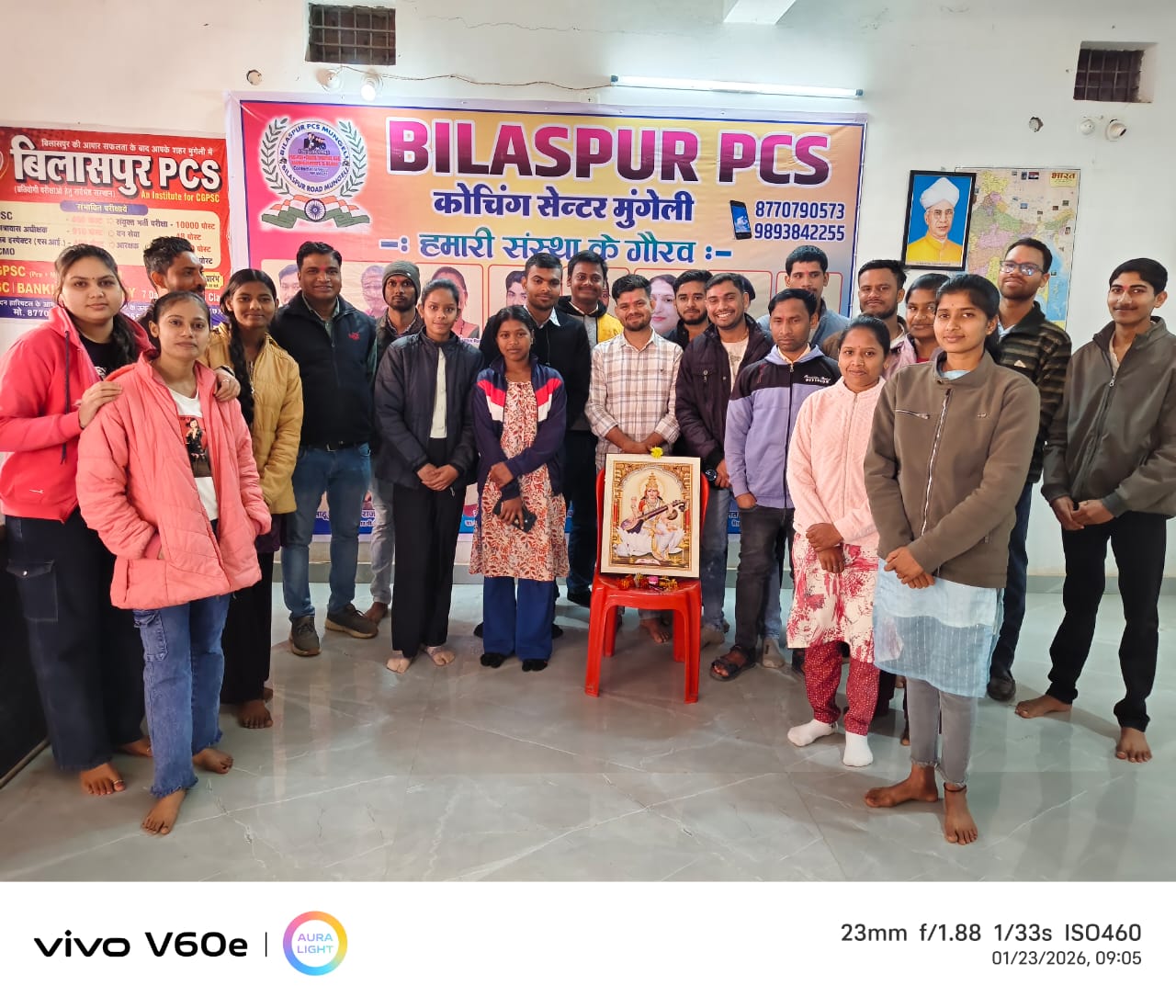 मुंगेली, कुणाल सिंह ठाकुर। दिनांक 23 जनवरी 2026 को बिलासपुर PCS कोचिंग सेंटर, मुंगेली में ज्ञान, विद्या और बुद्धि की अधिष्ठात्री देवी माँ सरस्वती की आराधना का पावन पर्व बसंत पंचमी बड़े ही श्रद्धा, उल्लास एवं भक्ति भाव के साथ मनाया गया। इस अवसर पर संपूर्ण कोचिंग परिसर भक्तिमय वातावरण से सराबोर नजर आया।कार्यक्रम की शुरुआत माँ सरस्वती जी की प्रतिमा के समक्ष विधिवत पूजा-अर्चना एवं मंत्रोच्चार के साथ की गई। कोचिंग सेंटर के सभी शिक्षकों एवं विद्यार्थियों ने एक-एक कर दीप प्रज्वलित किया तथा श्रीफल अर्पित कर माँ सरस्वती से आशीर्वाद प्राप्त किया। पूजा के दौरान विद्यार्थियों ने माँ सरस्वती से अपने शैक्षणिक जीवन में सफलता, एकाग्रता, ज्ञानवृद्धि एवं उज्ज्वल भविष्य की कामना की।इस अवसर पर उपस्थित शिक्षकों ने कहा कि बसंत पंचमी का पर्व विद्यार्थियों के जीवन में विशेष महत्व रखता है, क्योंकि यह दिन विद्या, कला और संस्कार को समर्पित होता है। माँ सरस्वती की आराधना से छात्रों में सकारात्मक सोच, अनुशासन और लक्ष्य के प्रति समर्पण की भावना विकसित होती है। शिक्षकों ने विद्यार्थियों को निरंतर परिश्रम करने, आत्मविश्वास बनाए रखने और अपने लक्ष्य की ओर निष्ठा से आगे बढ़ने का संदेश दिया।पूजन कार्यक्रम के पश्चात सभी विद्यार्थियों को प्रसाद वितरण किया गया। पूरे आयोजन के दौरान कोचिंग सेंटर में अनुशासन, सामूहिक सहभागिता और आध्यात्मिक ऊर्जा का सुंदर संगम देखने को मिला।इस कार्यक्रम के प्रत्यक्षदर्शी एवं संस्था में अध्ययनरत विद्यार्थीकरण सिंह राजपूत ने बताया कि इस प्रकार के आयोजन छात्रों के मनोबल को बढ़ाते हैं और पढ़ाई के साथ-साथ संस्कारों से भी जोड़ते हैं। उन्होंने कहा कि माँ सरस्वती की पूजा से विद्यार्थियों को नई ऊर्जा और प्रेरणा मिलती है, जिससे वे अपने लक्ष्य को प्राप्त करने के लिए और अधिक समर्पित होकर अध्ययन कर पाते हैं।कार्यक्रम का समापन माँ सरस्वती के जयकारों एवं सभी छात्रों के उज्ज्वल भविष्य की कामना के साथ किया गया।