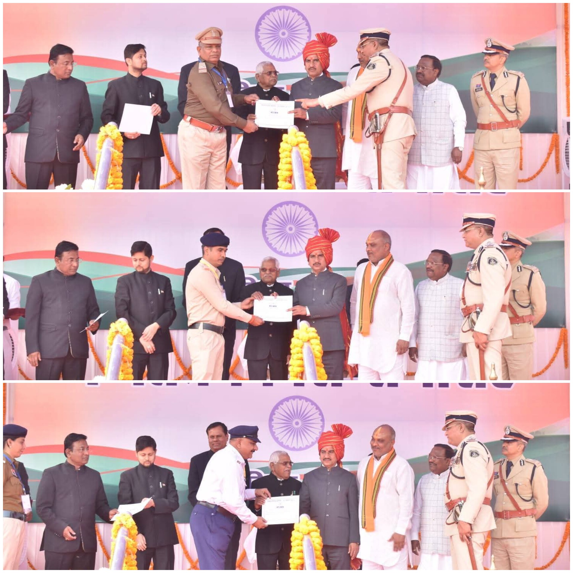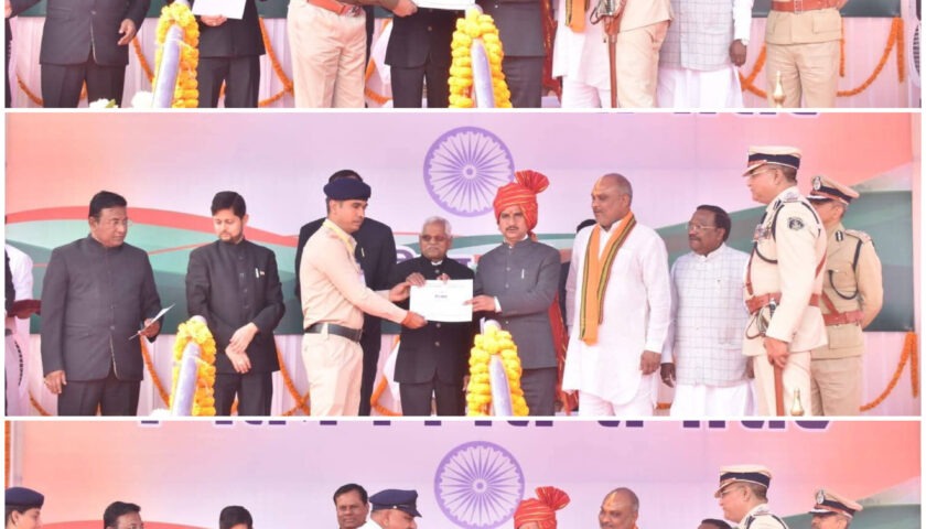 दुर्ग, कुणाल सिंह ठाकुर । दिनांक 26.01.2026 को गणतंत्र दिवस के पावन अवसर पर पं. रविशंकर स्टेडियम, दुर्ग में आयोजित जिला स्तरीय गणतंत्र दिवस परेड समारोह में मुख्य अतिथि माननीय केंद्रीय राज्य मंत्री तोखन साहू द्वारा यातायात पुलिस दुर्ग के उत्कृष्ट कार्य करने वाले पुलिस कर्मियों को प्रशस्ति पत्र प्रदान कर सम्मानित किया गया। इस अवसर पर यातायात पुलिस में पदस्थ एएसआई सुशील पांडे, आरक्षक विजय शर्मा एवं आरक्षक राम साहू को उनके द्वारा कर्तव्य के प्रति निष्ठा, अनुशासन, जिम्मेदारीपूर्ण कार्यशैली एवं यातायात व्यवस्था को सुचारू बनाए रखने में किए गए उल्लेखनीय योगदान के लिए सम्मानित किया गया। सम्मान समारोह के दौरान मुख्य अतिथि द्वारा इन पुलिसकर्मियों के कार्यों की सराहना करते हुए कहा गया कि यातायात पुलिस की भूमिका सड़क सुरक्षा, यातायात नियमों के प्रभावी क्रियान्वयन एवं आम नागरिकों को सुरक्षित परिवहन उपलब्ध कराने में अत्यंत महत्वपूर्ण है। सम्मानित कर्मियों ने अपने दायित्वों का निर्वहन करते हुए यातायात नियंत्रण, जनजागरूकता, दुर्घटना रोकथाम एवं कानून व्यवस्था बनाए रखने में निरंतर सराहनीय कार्य किया है। इस अवसर पर जिला प्रशासन, पुलिस प्रशासन के वरिष्ठ अधिकारी, जनप्रतिनिधिगण, विभिन्न विभागों के अधिकारी-कर्मचारी एवं बड़ी संख्या में आम नागरिक उपस्थित रहे। सम्मानित किए गए यातायात पुलिस कर्मियों के इस उपलब्धि से संपूर्ण पुलिस बल का मनोबल बढ़ा है तथा अन्य कर्मियों को भी अपने कर्तव्यों का निष्ठा एवं ईमानदारी से पालन करने की प्रेरणा प्राप्त हुई है।