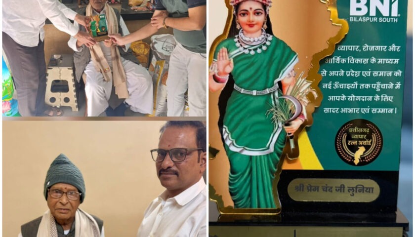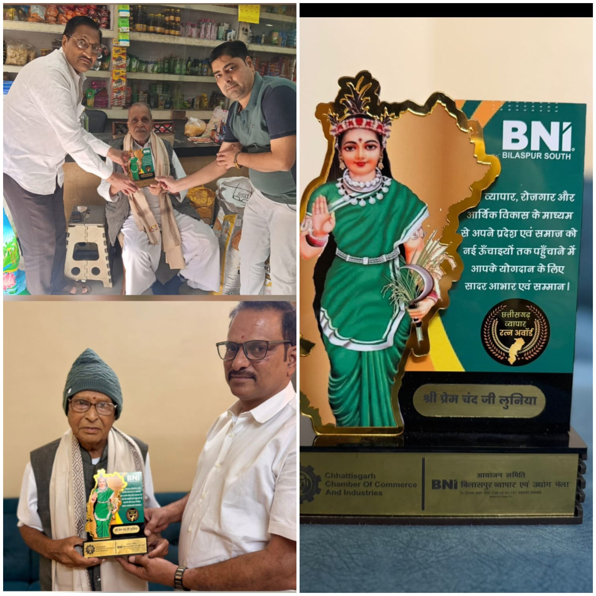 बिलासपुर, कुणाल सिंह ठाकुर। छत्तीसगढ़ की न्यायधानी बिलासपुर में आयोजित समारोह में प्रदेश के व्यापार जगत की दो दिग्गज हस्तियों को उनकी विशिष्ट सेवाओं के लिए सम्मानित किया गया। छत्तीसगढ़ चैंबर ऑफ कॉमर्स रायपुर एवं बी.एन.आई. (BNI) बिलासपुर के संयुक्त तत्वावधान में आयोजित इस कार्यक्रम में चैंबर के वरिष्ठ सदस्य नारूमल आर. तानी एवं प्रेमचंद जी लुनिया को ‘छत्तीसगढ़ व्यापार रत्न’ अलंकरण से नवाजा गया।