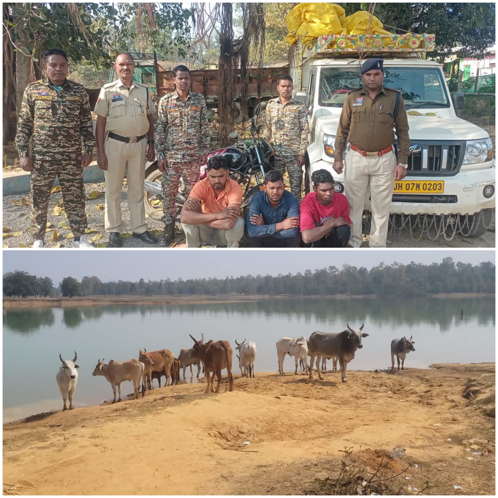 उसके पीछे आ रहे पिकअप वाहन क्रमांक JH 07 M 0203 को रोककर जांच करने पर चालक पवन राम निवासी बधीमा जिला जशपुर तथा उसके साथ परमेश्वर यादव निवासी सिंगीबहार थाना तपकरा जिला जशपुर मिले। वाहन की तलाशी लेने पर उसमें 10 नग गौवंश को रस्सियों से बांधकर क्रूरतापूर्वक उड़ीसा के बुचड़खाने ले जाने की तैयारी पाई गई। पुलिस ने आरोपियों के कब्जे से पिकअप वाहन कीमत 6 लाख रुपये, 10 नग गौवंश कीमत 2.55 लाख रुपये तथा होंडा साइन मोटरसाइकिल कीमत 1 लाख रुपये, कुल 9 लाख 55 हजार रुपये की संपत्ति जप्त कर आरोपियों के विरुद्ध पुलिस चौकी जोबी (थाना खरसिया) में छत्तीसगढ़ कृषक पशु परिरक्षण अधिनियम की धारा 4, 6, 10, 11 तथा पशु क्रूरता निवारण अधिनियम की धारा 11 के तहत अपराध पंजीबद्ध कर तीनों आरोपियों को गिरफ्तार कर न्यायिक रिमांड पर भेजा गया है। कार्रवाई में चौकी प्रभारी एएसआई लक्ष्मी राठौर तथा हमराह आरक्षक राजेंद्र राठिया, राजेश सिदार, और अश्वनी सिदार की अहम भूमिका रही है ।