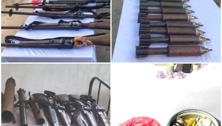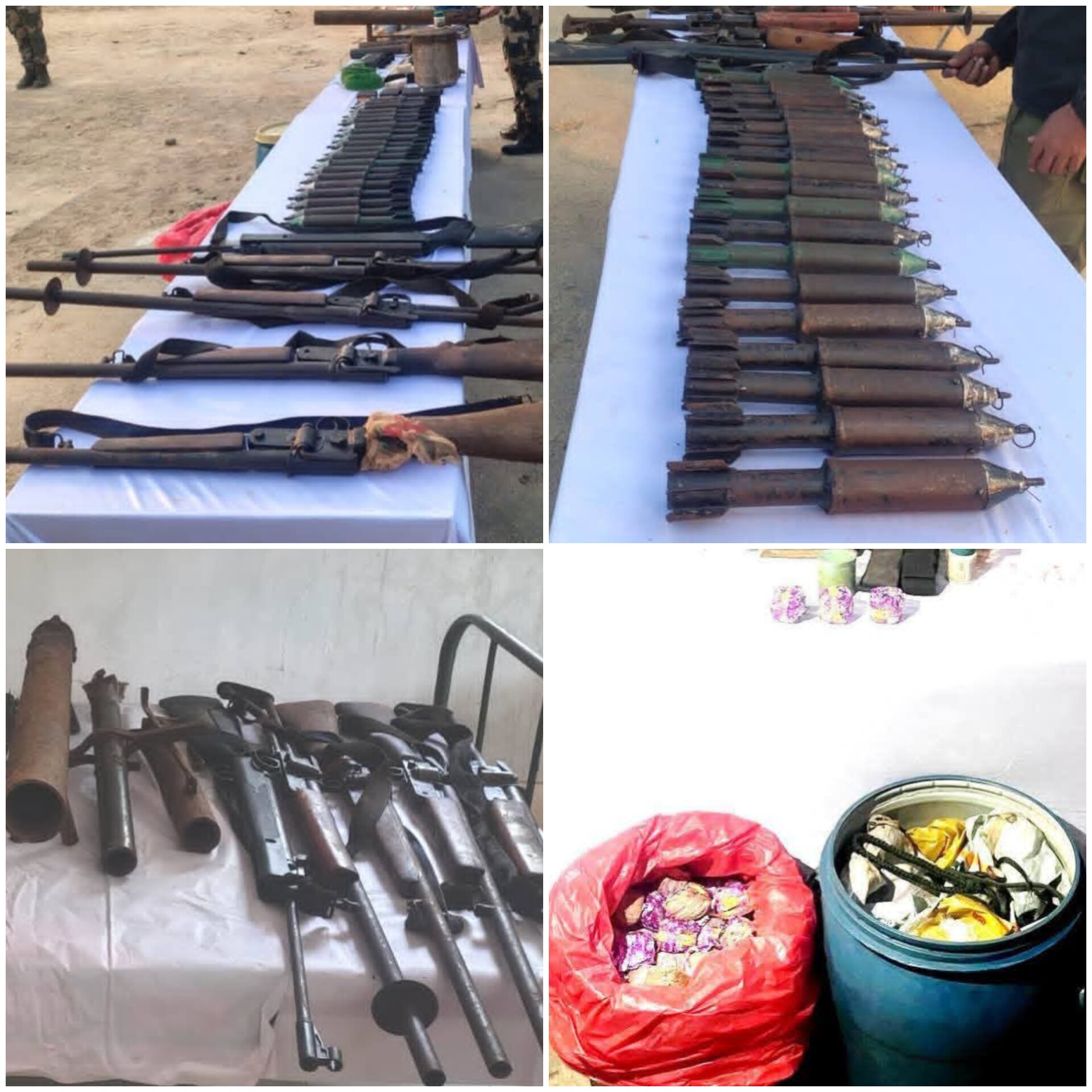 बरामद सामग्री:▪️ बीजीएल लांचर – 02 नग▪️ 12 बोर बंदूक – 02 नग▪️ एयरगन – 01 नग▪️ डायरेक्शन आईईडी – 03 नग▪️ टिफिन आईईडी (लगभग 05 कि.ग्रा.) – 01 नग▪️ बीजीएल बम – 30 नग▪️ 12 बोर राउंड – 26 नग▪️ बारूद (प्लास्टिक पैकेट में लगभग 02 कि.ग्रा.)▪️ मल्टीमीटर – 01 नग▪️ फटाखा – 12 पैकेट▪️ बिजली वायर – 02 बंडल▪️ पोच – 02 नग▪️ स्प्लिंटर – 01 पैकेट▪️ नक्सल साहित्य एवं अन्य सामग्री