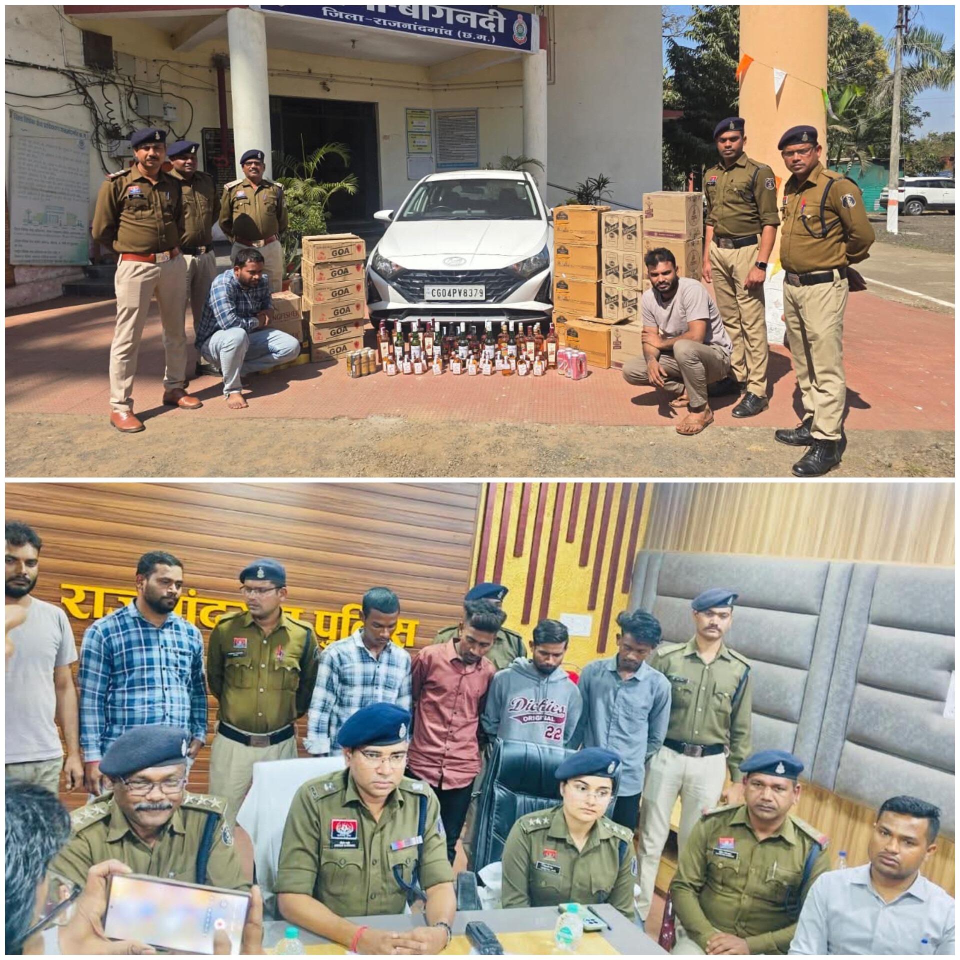 राजनांदगांव, द मीडिया पॉइंट। पुलिस अधीक्षक के निर्देशन पर अतिरिक्त पुलिस अधीक्षक के मार्गदर्शन में नगर पुलिस अधीक्षक राजनांदगांव (साइबर) एवं एसडीओपी डोंगरगढ़ के पर्यवेक्षण में अवैध शराब तस्करों एवं कोचियों के विरूद्ध चलाये जा रहे अभियान के तहत दिनांक 17.02.2026 को साइबर सेल व थाना बागनदी संयुक्त टीम द्वारा बागनदी चौक के पास Hyundai i 20 कार में परिवहन करते 02 आरोपियों के कब्जे से 228 बल्क लीटर (कीमत ₹2,82,630/-) एवं थाना डोंगरगढ़ पुलिस द्वारा थाना क्षेत्र के देवकट्टा-खैरागढ़ मुख्य मार्ग पर परिवहन करते हुये काले रंग की स्कॉर्पियों वाहन में 04 आरोपियों के कब्जे से 32.04 बल्क लीटर (कीमती ₹19,980/-) जप्त की गई।इस प्रकार उपरोक्त प्रकरणों में कुल 06 आरोपियों के कब्जे से दो चारपहिया वाहनों में कुल अंग्रेजी शराब 29 पेटी (260.8 बल्क लीटर) कीमती 3,02,610/-रूपये जप्त की गई।