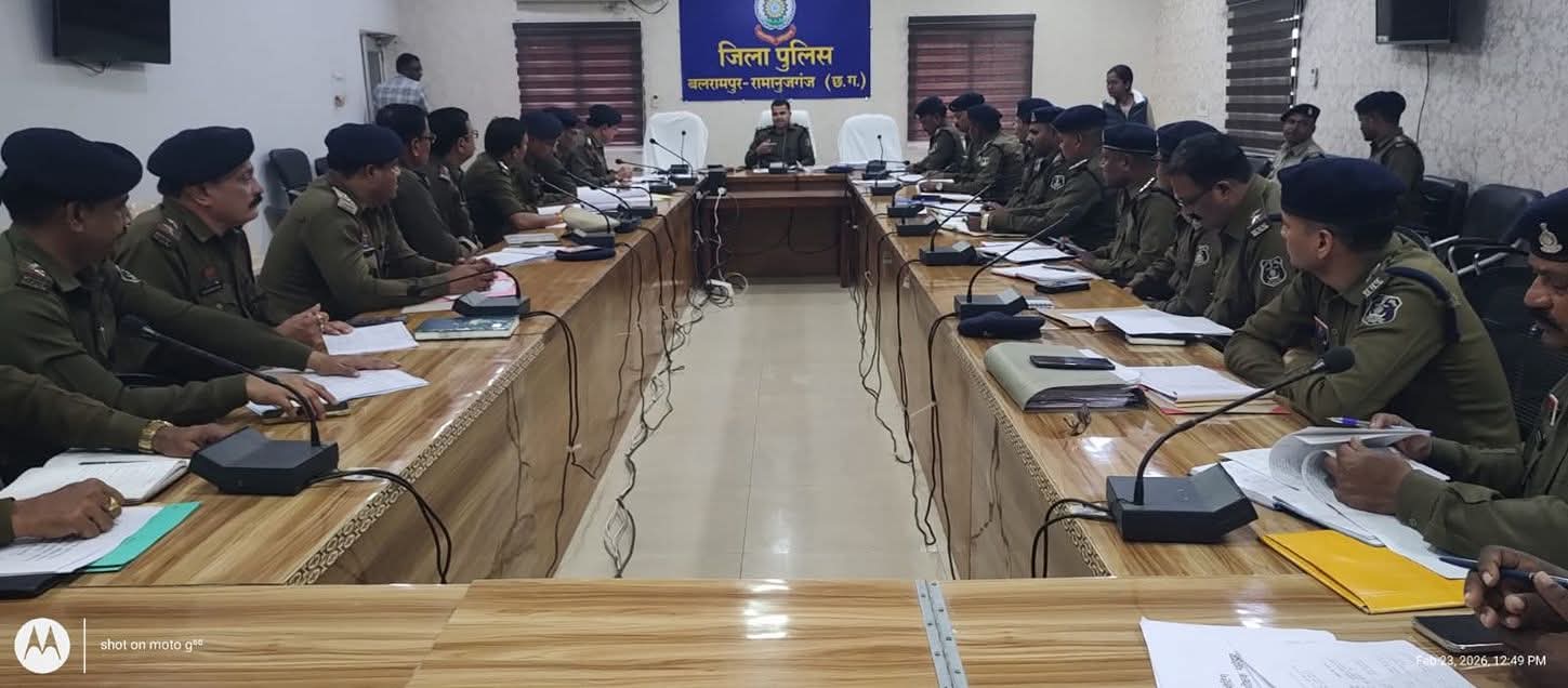 बलरामपुर-रामानुजगंज, द मीडिया पॉइंट। पुलिस अधीक्षक वैभव बैंकर के नेतृत्व में आज दिनांक23 फरवरी 2026 को पुलिस अधीक्षक कार्यालय के सभागार में एक महत्वपूर्ण अपराध समीक्षा बैठक का आयोजन किया गया। इस बैठक में जिले में लंबित अपराधों, मर्ग, गुमशुदा व्यक्तियों के मामले, एक वर्ष से अधिक समय से लंबित गंभीर अपराध, ऑपरेशन मुस्कान, एनडीपीएस अधिनियम, आईटी अधिनियम और साइबर अपराध, महिलाओं से संबंधित अपराध, प्रतिबंधात्मक कार्यवाही, यातायात स्थिति, कानून और व्यवस्था, संवेदनशील पुलिसिंग, साइबर अपराध, एनडीपीएस, पॉक्सो अधिनियम और यातायात के प्रति जागरूकता जैसे विषयों की गहन समीक्षा की गई।