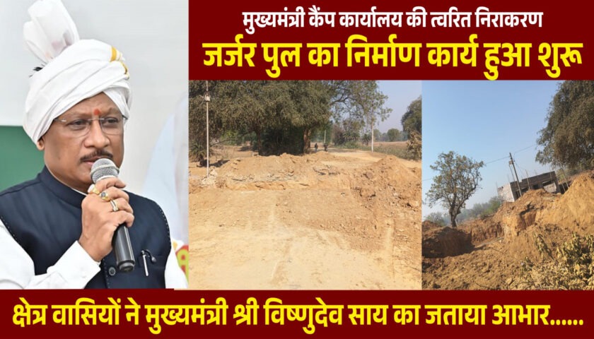 मुख्यमंत्री कैंप कार्यालय बगिया को जानकारी मिलने के बाद अधिकारियों को तत्काल आवश्यक कार्रवाई के निर्देश दिए गए। निर्देश मिलते ही संबंधित विभाग ने स्थल पर पहुंचकर पुल निर्माण का कार्य प्रारंभ कर दिया है। निर्माण कार्य पूर्ण होने के बाद क्षेत्रवासियों को सुरक्षित और सुगम आवागमन की सुविधा मिल सकेगी।पुल निर्माण कार्य शुरू होने से क्षेत्र में खुशी का माहौल है। स्थानीय ग्रामीणों और राहगीरों ने मुख्यमंत्री विष्णु देव साय के प्रति आभार व्यक्त करते हुए कहा कि वर्षों पुरानी समस्या का अब समाधान होने जा रहा है।
