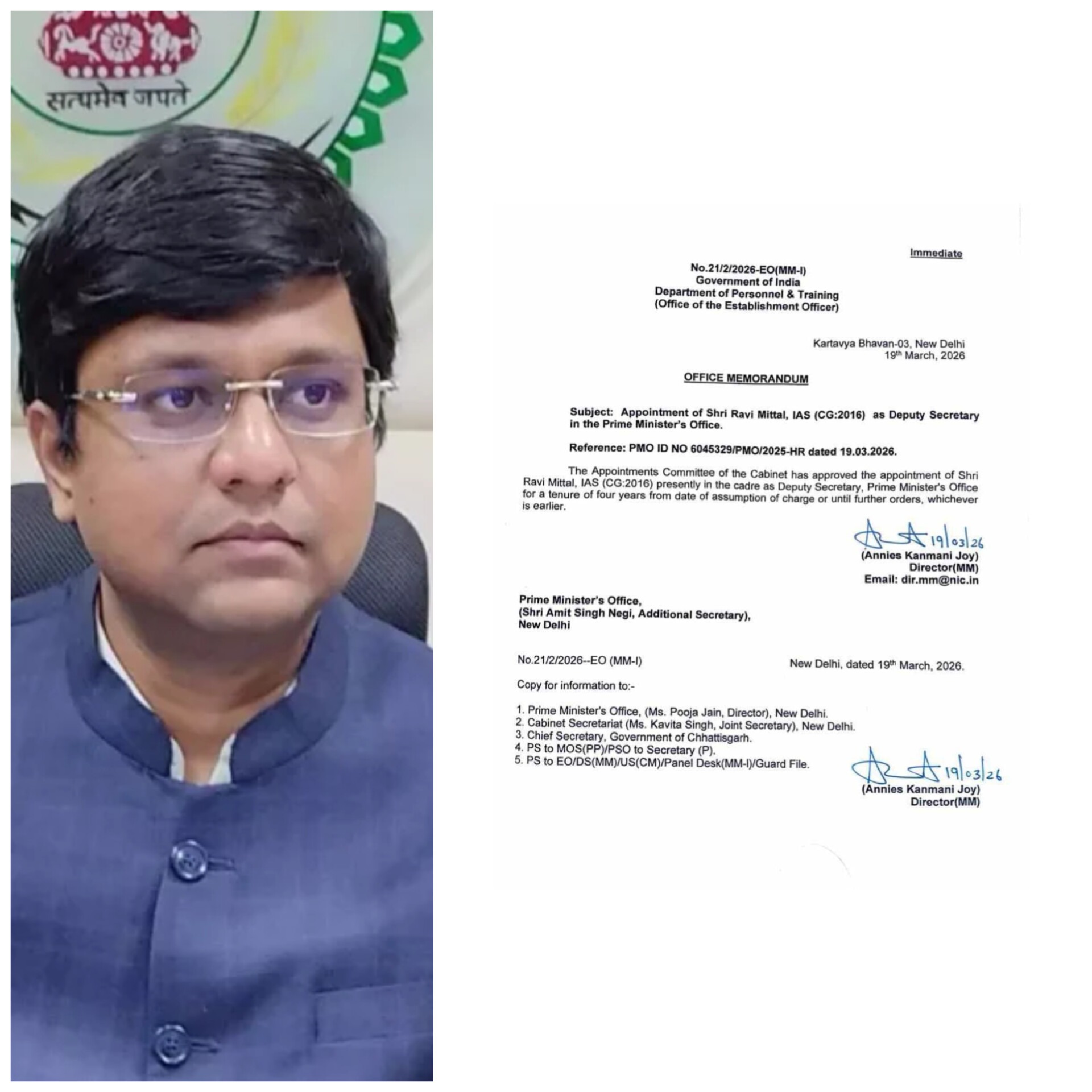 रायपुर, द मीडिया पॉइंट। छत्तीसगढ़ कैडर के 2016 बैच के IAS अधिकारी रवि मित्तल को केंद्र सरकार ने बड़ी जिम्मेदारी सौंपी है। उन्हें प्रधानमंत्री कार्यालय (PMO) में डिप्टी सेक्रेटरी पद पर नियुक्त किया गया है।यह नियुक्ति कैबिनेट की नियुक्ति समिति (ACC) की मंजूरी के बाद की गई है। कार्मिक एवं प्रशिक्षण विभाग (DoPT) द्वारा जारी आदेश के अनुसार, उनका कार्यकाल पदभार ग्रहण करने की तारीख से चार वर्ष या अगले आदेश तक रहेगा।