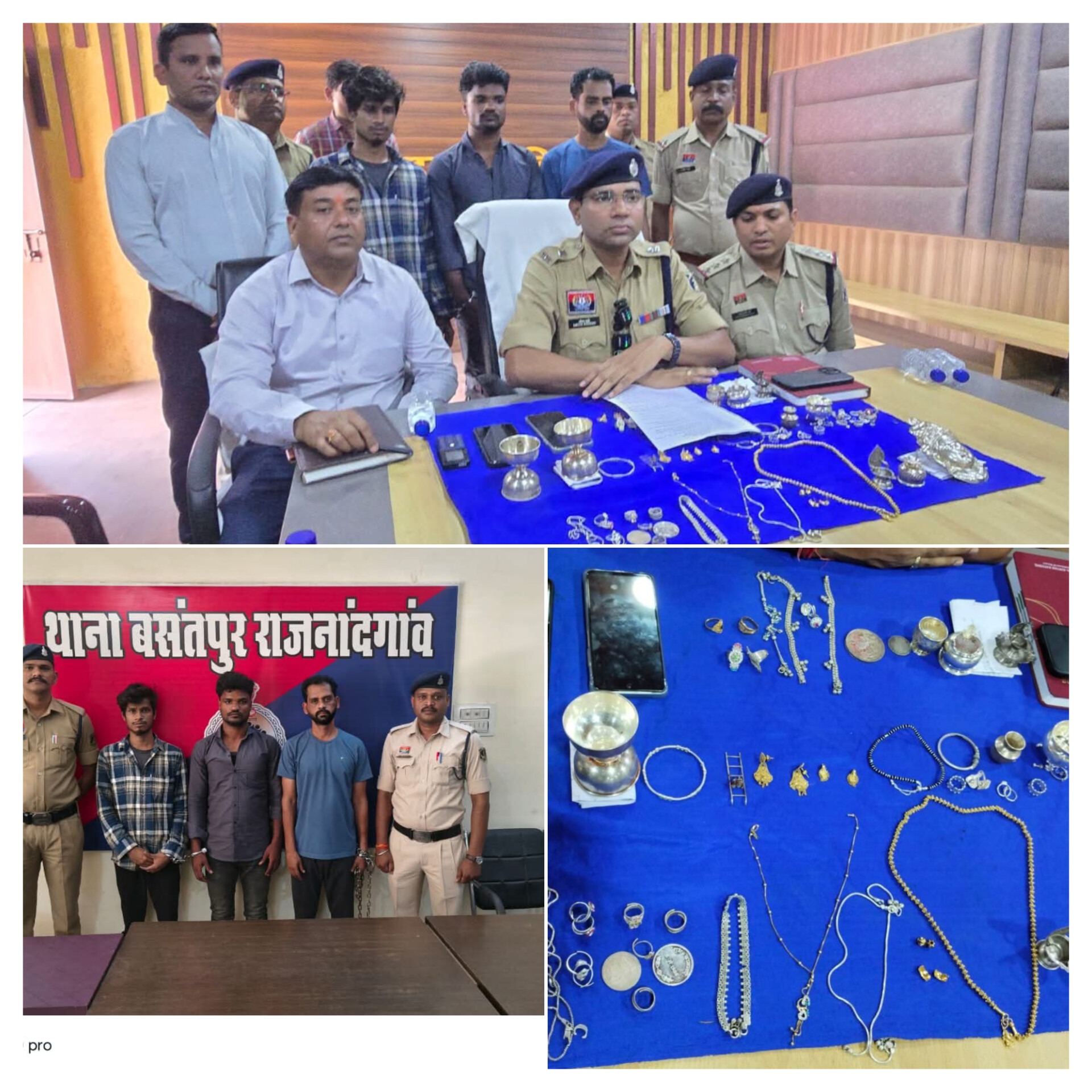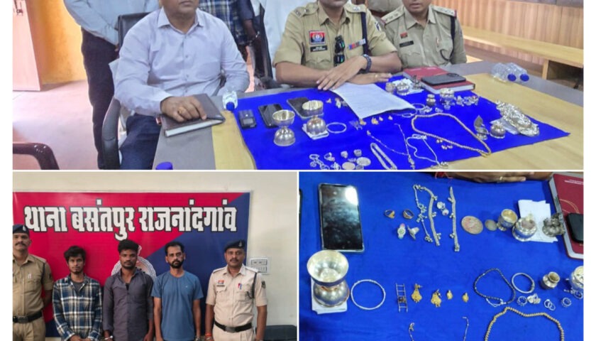 राजनांदगांव, द मीडिया पॉइंट। दिनांक 14.03.2026 को प्रार्थिया निवासी जीवन-ए कॉलोनी, राजनांदगांव द्वारा रिपोर्ट दर्ज कराई गई कि रात्रि लगभग 03:00 बजे अज्ञात 03-04 व्यक्ति उसके मकान का दरवाजा तोड़कर अंदर घुस आए। आरोपियों ने उसे डराकर आलमारी में रखे सोने-चांदी के जेवरात चोरी कर लिए।रिपोर्ट पर थाना बसंतपुर में अपराध क्रमांक 127/26 धारा 331(4), 305, 3(5) भारतीय न्याय संहिता के तहत अपराध पंजीबद्ध कर विवेचना में लिया गया।
