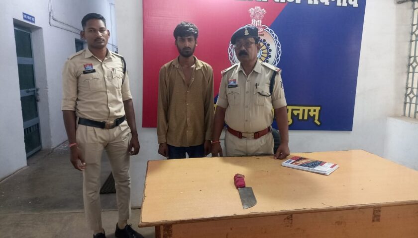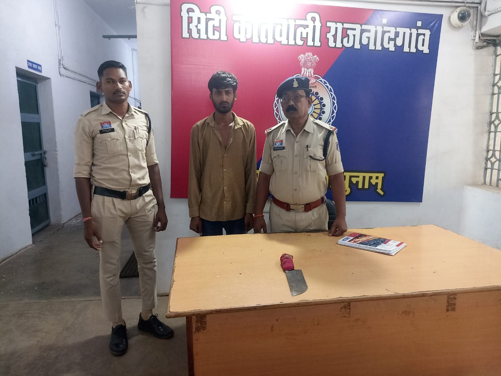 राजनांदगांव, द मीडिया पॉइंट। दिनांक 05.04.2026 को विश्वस्त सूत्रों से जानकारी मिला कि लखोली बायपास ओव्हर ब्रीज के नीचे कृष्णा शर्मा नामक व्यक्ति किसी घटना को अंजांम देने की नियत से धारदार रखा है। कि सूचना पर मौका पहुंचकर घेराबंदी कर पकड़े नाम पता पूछने पर अपना नाम व पता कृष्णा शर्मा पिता दीपक शर्मा उम्र 21 वर्ष साकिन संतोषी नगर मुरूम खदान बायपास ब्रीज के पास लखोली थाना कोतवाली जिला राजनांदगांव (छ0ग0) बताया। तलाशी लेने पर एक नग लोहे का धारदार चाकुनूमा कत्ता बरामद हुआ। जिसे वजह सबूत में जप्त कर अपराध सबूत पाये जाने से अप0क्र0 194/26 धारा 25 आर्म्स एक्ट कायम कर विधिवत गिरफ्तार कर माननीय न्यायालय के समक्ष पेश कर न्यायिक अभिरक्षा में जेल भेजा गया। आगे भी चाकूबाजों एवं असामाजिक तत्वों के खिलॉफ कार्यवाही जारी रहेगी।