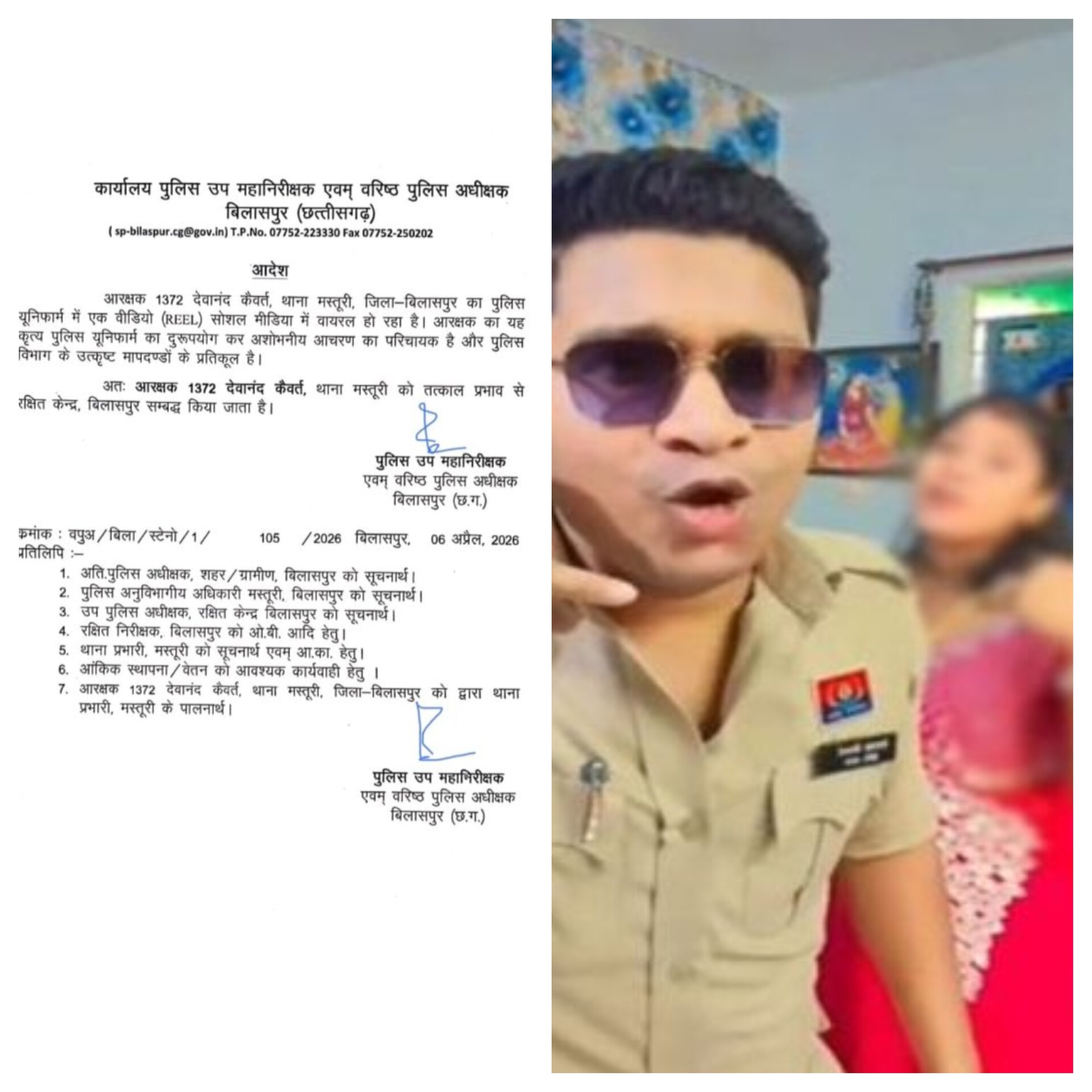 वीडियो वायरल होने के बाद वरिष्ठ अधिकारियों ने तुरंत संज्ञान लिया। मामले को गंभीरता से लेते हुए एसएसपी रजनेश सिंह ने आदेश जारी कर आरक्षक को मस्तूरी थाने से हटाकर रक्षित केंद्र, बिलासपुर अटैच कर दिया। यह आदेश तत्काल प्रभाव से लागू किया गया है। बताया जा रहा है कि आरक्षक ने अपनी पत्नी के साथ “हैलो रानी, हाय रानी” गाने पर वर्दी में रील बनाकर उसे सोशल मीडिया पर अपलोड किया था, जिसके बाद यह मामला चर्चा में आ गया।इस कार्रवाई को पुलिस विभाग में अनुशासन और वर्दी की गरिमा बनाए रखने के सख्त संदेश के रूप में देखा जा रहा है। साफ है कि वर्दी के सम्मान से किसी भी प्रकार का समझौता बर्दाश्त नहीं किया जाएगा।