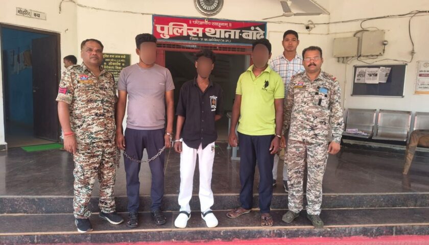 कांकेर, द मीडिया पॉइंट। पुलिस अधीक्षक कांकेर निखिल अशोक कुमार राखेचा के निर्देशन में, अतिरिक्त पुलिस अधीक्षक राकेश कुर्रे के मार्गदर्शन में एवं अनुविभागीय अधिकारी पुलिस रवि कुजूर तथा डॉ. मेखलेन्द्र प्रताप सिंह के पर्यवेक्षण में दिनांक 07.04.2026 बान्दे पुलिस द्वारा पीव्ही-83 गोविन्दपुर तिराहा मेन रोड के पास घेराबंदी कर कार्रवाई की गई, जिसमें तीन आरोपियों को 33.460 किलोग्राम अवैध गांजा परिवहन करते हुए रंगे हाथ गिरफ्तार किया गया।थाना बान्दे में अपराध क्रमांक 28/2026 धारा 20(b)(ii)(C) NDPS Act के तहत प्रकरण दर्ज कर विवेचना में लिया गया है।