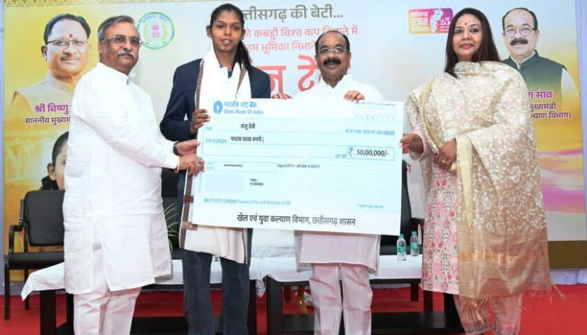 रायपुर, द मीडिया पॉइंट। भारत को कबड्डी विश्वकप और एशियन चैंपियनशिप दिलाने में अहम भूमिका निभाने वाली संजू देवी को राज्य शासन के खेल एवं युवा कल्याण विभाग द्वारा 50 लाख रुपए की प्रोत्साहन राशि प्रदान की गई है। छत्तीसगढ़ में पहली बार किसी खिलाड़ी को इतनी बड़ी प्रोत्साहन राशि दी गई है। उप मुख्यमंत्री तथा खेल एवं युवा कल्याण मंत्री अरुण साव ने आज नवा रायपुर स्थित अपने निवास कार्यालय में आयोजित सम्मान समारोह में उन्हें यह राशि सौंपी। साव ने इस दौरान बिलासपुर के चिंगराजपारा कबड्डी क्लब को कबड्डी मैट भी प्रदान किया।