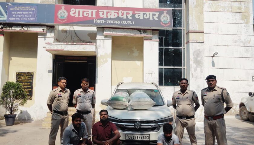 रायगढ़, द मीडिया पॉइंट। वरिष्ठ पुलिस अधीक्षक शशि मोहन सिंह के दिशा निर्देशन में जिले में अवैध मादक पदार्थों के विरुद्ध चलाए जा रहे अभियान “ऑपरेशन आघात” के तहत लगातार दूसरे दिन बड़ी कार्रवाई करते हुए थाना साइबर और चक्रधरनगर पुलिस की संयुक्त टीम ने उड़ीसा से गांजा तस्करी कर रायगढ़ लाए जा रहे तीन आरोपियों को गिरफ्तार किया है। पुलिस ने आरोपियों के कब्जे से 36 किलो 170 ग्राम गांजा, एक चारपहिया वाहन और मोबाइल सहित कुल लगभग 15 लाख 60 हजार रुपये की संपत्ति जब्त की है।